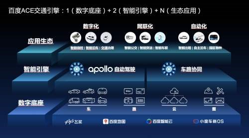 據(jù)介紹,百度“ACE交通引擎”(Autonomous Driving、Connected Road、Efficient Mobility,即自動駕駛、車路協(xié)同、高效出行),采用了“1+2+N”的系統(tǒng)架構(gòu),即“一大數(shù)字底座、兩大智能引擎、N大應(yīng)用生態(tài)”。其中一大數(shù)字底座指“車”、“路”、“云”、“圖”等數(shù)字交通基礎(chǔ)設(shè)施,包括小度車載OS、飛槳、百度智能云、百度地圖。兩大智能引擎分別是Apollo自動駕駛引擎和車路協(xié)同引擎。N大應(yīng)用生態(tài),包括智能信控、智能停車、交通治理、智能公交、智能貨運、智能車聯(lián)、智能出租、自主泊車和園區(qū)物種等。