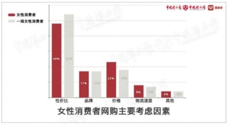 近五成女性消費(fèi)者,將性價(jià)比列為購(gòu)物的第一考慮因素,拼多多等“性價(jià)比”電商平臺(tái)成為了她們的首選