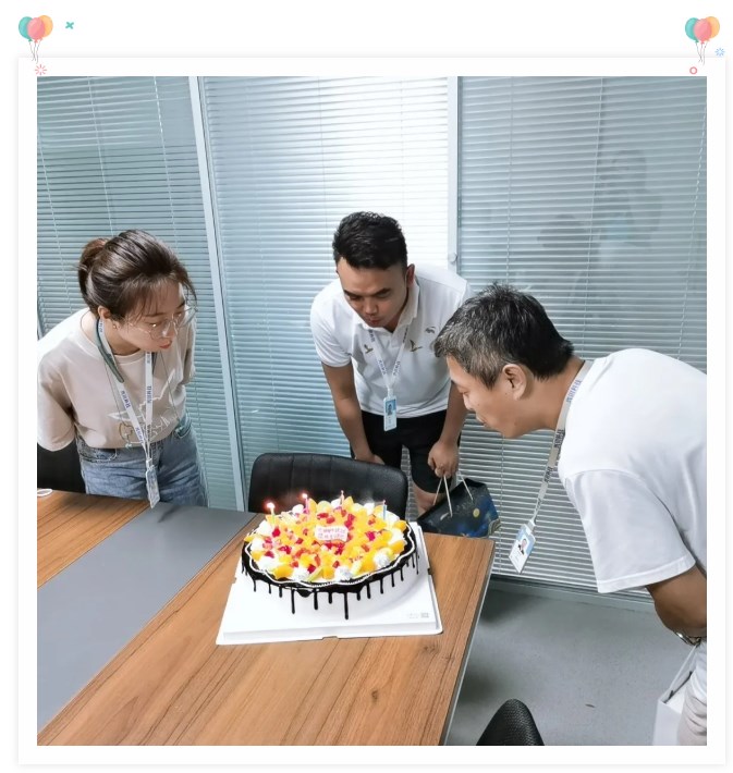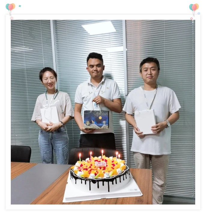 緊閉的會(huì)議室大門掩蓋不住陣陣歡聲笑語(yǔ),后勤部為本月壽星送上精心準(zhǔn)備的小禮物,并端來(lái)了美味可口的生日蛋糕。三位壽星圍在一起吹滅生日蠟燭,許下美好心愿。