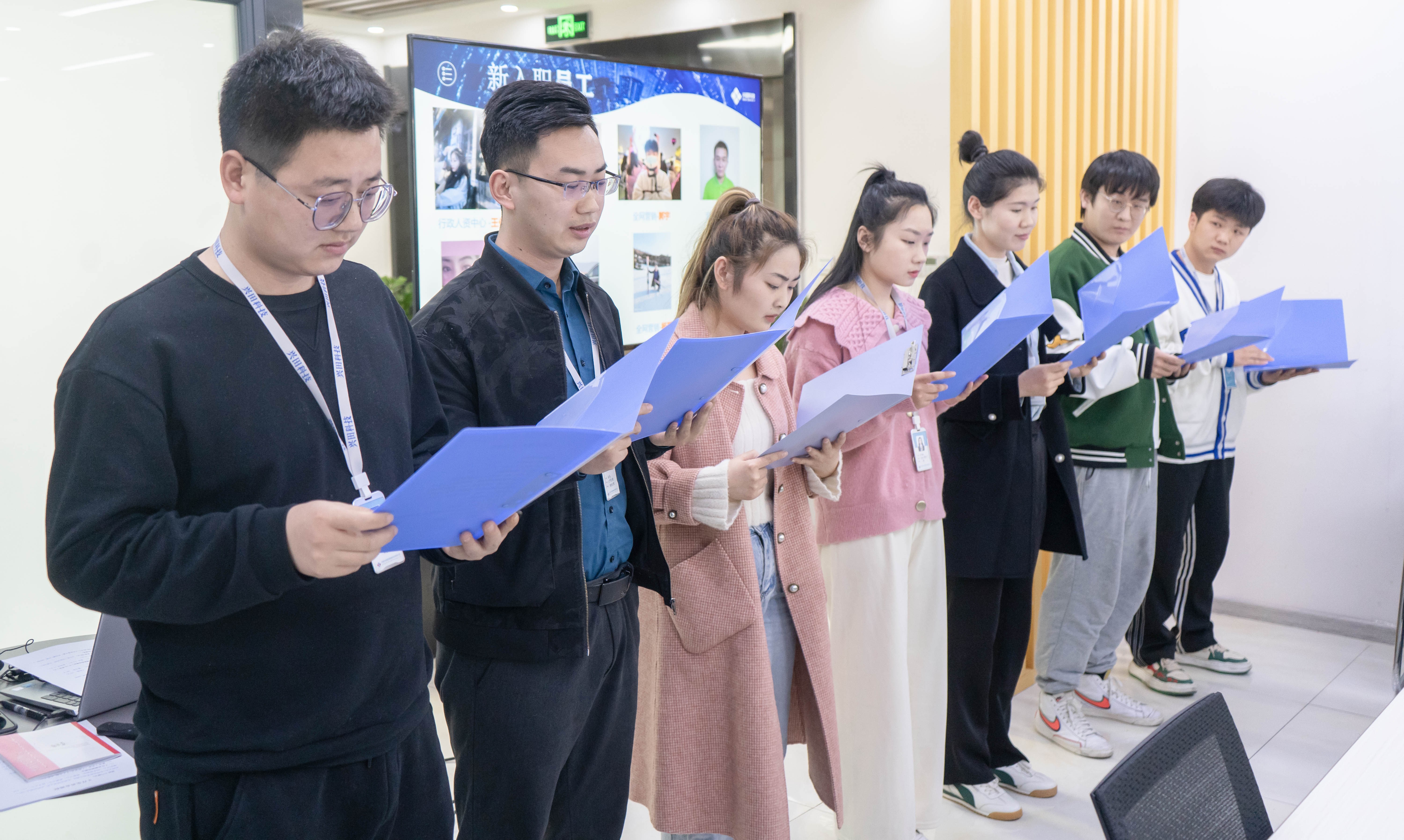 會(huì)議第一項(xiàng)是團(tuán)隊(duì)士氣展示,各個(gè)部門的小伙伴們上臺(tái)展現(xiàn)出自己自己團(tuán)隊(duì)的士氣與風(fēng)采。會(huì)議第二項(xiàng)是新員工入職儀式,上個(gè)月一共入職了7位小伙伴,各位的加入為興田注入了新鮮血液,增添了新生力量。